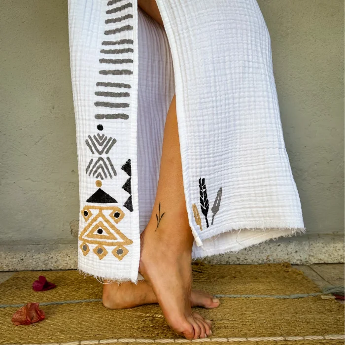Boho Müslin Pantolon %100 Pamuk Müslin kumaştan üretilmiş anvalop pantolon, deniz kenarında kullanıma uygundur. Desen detayları el oyması ağaç baskıdır. Tamamı El Yapımıdır. Pantolonun giyiliş şeklini görmek için linke tıklayabilirsiniz. Ürün Tek Bedendir. Pantolon Boyu: 100 cm. Modelin Bedeni: S Modelin Boyu:1.65 CM.