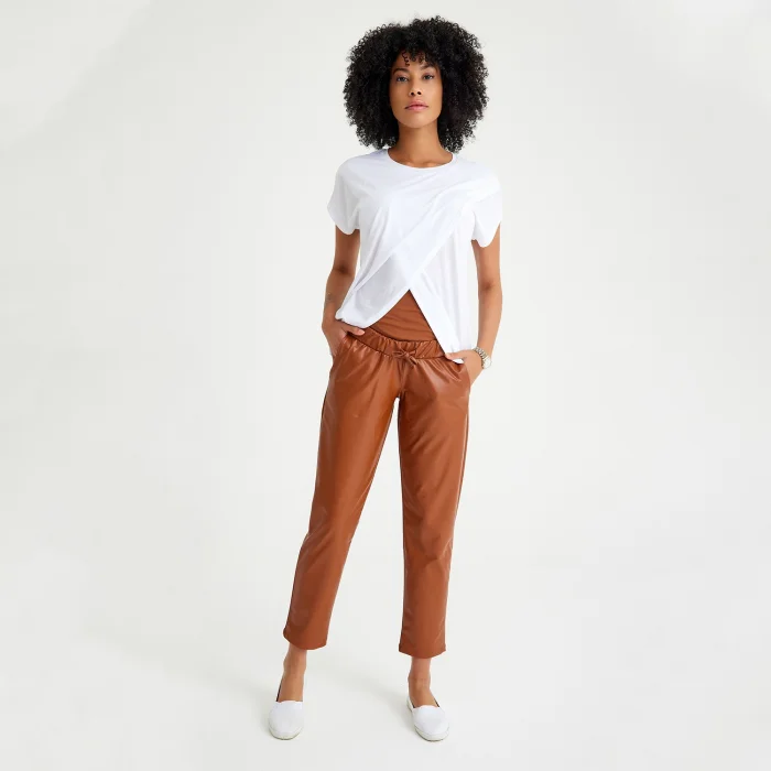 Mat deri görüntüsü ile şıklık, kesimi ile rahatlık sağlayan, zamandan ve mekandan bağımsız bir pantolon. Pamuklu kısmı göbeği yumuşacık sararırken ve iyi hissettirirken, paçaya doğru daralan kesimi sizi ince ve zarif gösterir. Doğum sonrasında pamuklu kısmı katlayarak kullanmaya devam edebilir, varsa sezaryen dikişlerinizin iyileşmesini destekleyebilirsiniz.