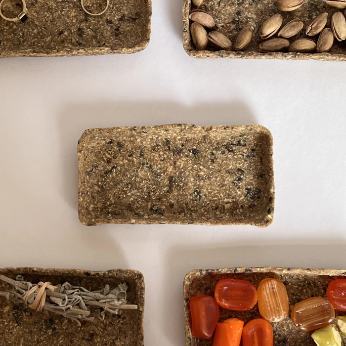 Yeşil kabuklu sebze-meyve ve doğal malzemelerin ileri dönüştürülmesiyle şekillenen, el yapımı biyoçözünür sunumluk