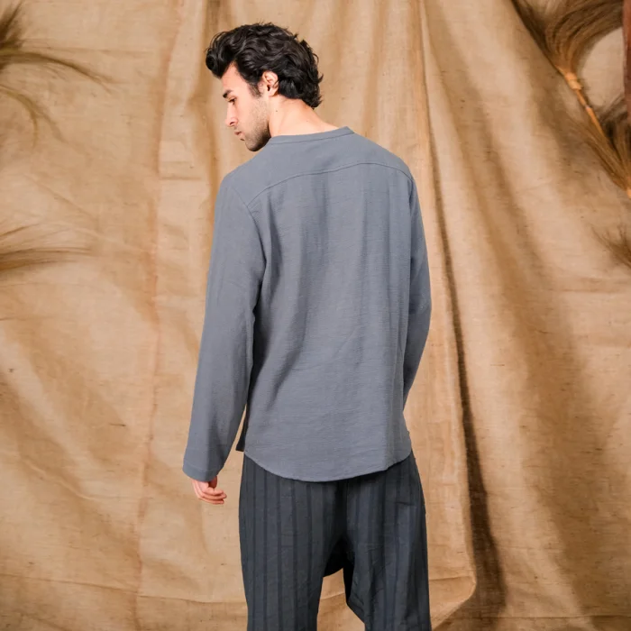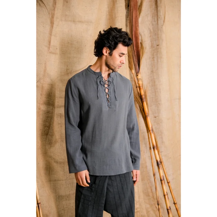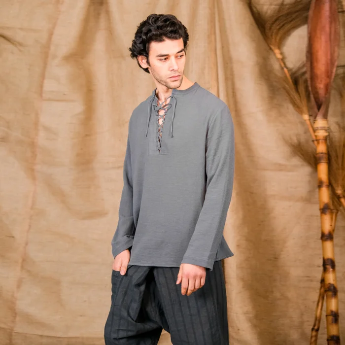 Heros, bağcıklı yakalı üst. Çok hassas el dokuması keten kumaştan üretilen rahat kesim üst, Philio veya Simbad pantolonlarımızla rahatlıkla kombinlenebilir. İnce bir vücuda sahip olanlar bir sonraki bedeni küçültmek isteyebilirler. Model ayrıca Simbad Pant giyiyor.