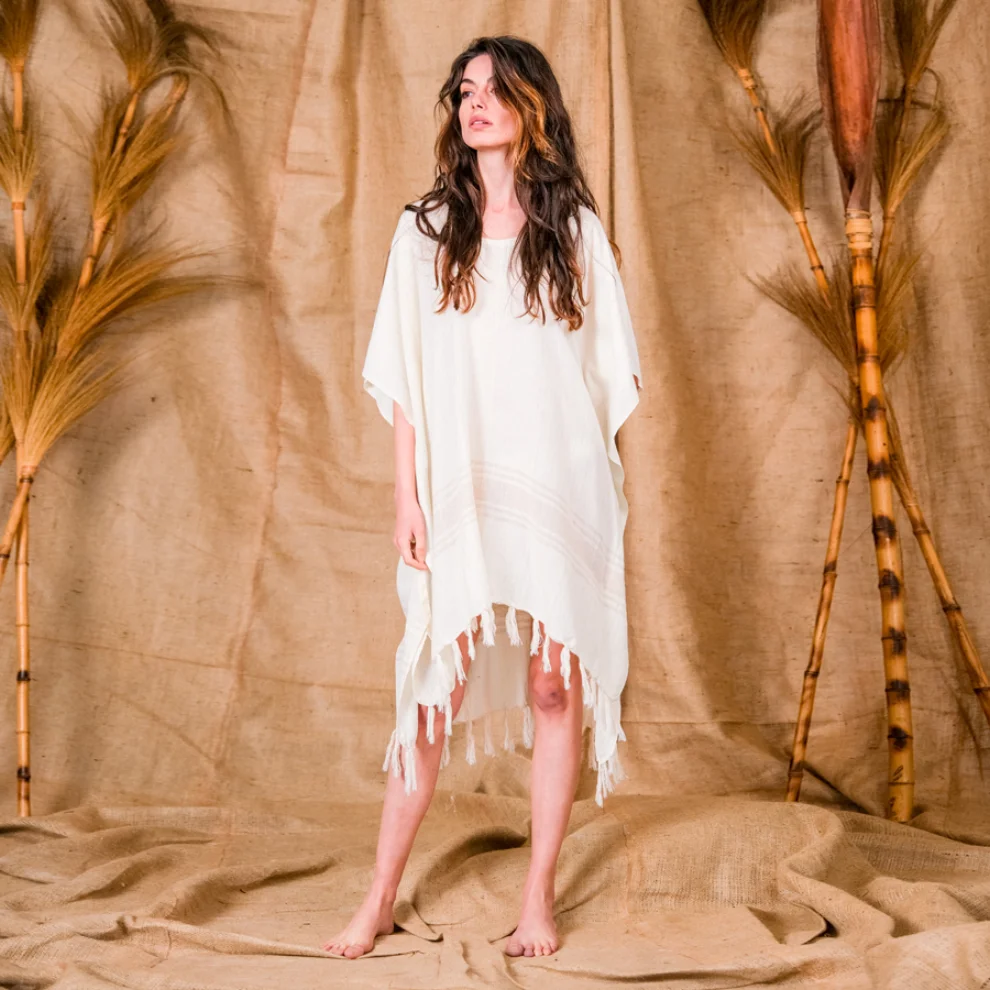 Selene; pamuk ağırlıklı el dokuması kumaştan önü kısa arkası uzun poncho. Pamuk ağırlıklı ve hafif gramajlı el dokuması kumaşı sayesinde fazlasıyla su emicidir ve de çok çabuk kurur. Mayo veya bikinilerinin üzerine harika gider.