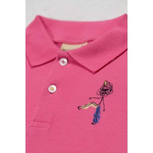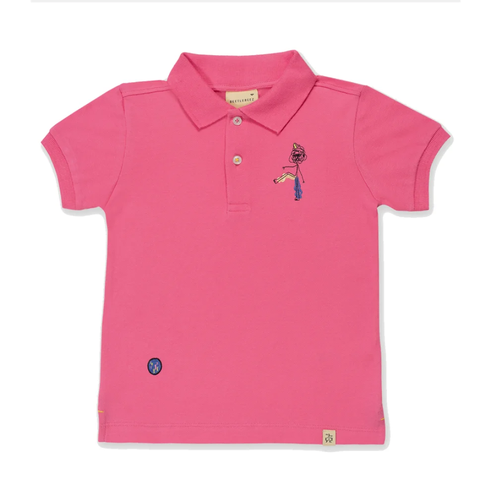 Organik pamuklu, eğlenceli nakışlı, unisex ve rahat kalıp polo yaka t-shirt.