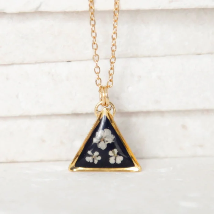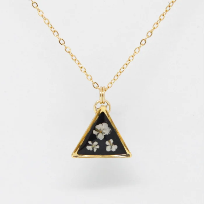 İçinde kurutulmuş gerçek queen anne's lace çiçekleri bulunan paslanmaz çelik & reçine kolye. 14 mm üçgen  kenar uzunluğu