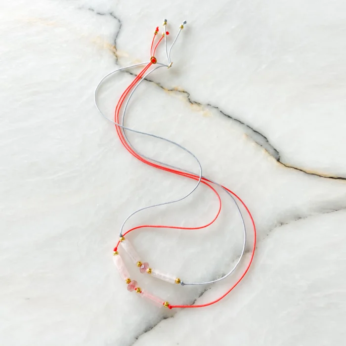 Rose ve çilek quartzlar kullanarak tasarladığımız Cosmic Lovepotion bilekliğimizde 925 ayar gümüş üzeri 18 ayar 1 mikron altın kaplama kilit ve parçalar kullanılmıştır. İp uzunluğu 60 cm’dir. Dilerseniz halhal olarak da kullanabilirsiniz.