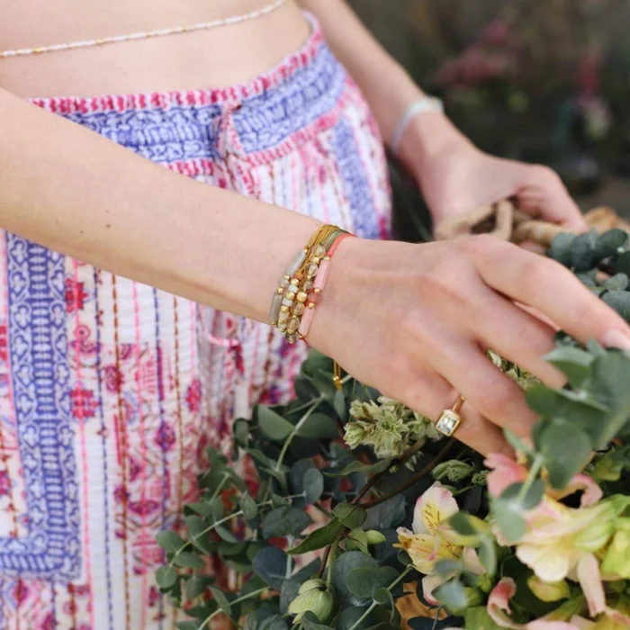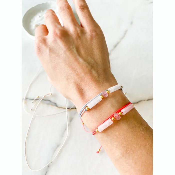 Pudradan pembeye giden tonlarıyla ikonik bir taş olan rose quartz, muhteşem renginden dolayı antik çağlardan günümüze hep “aşk taşı” olarak adlandırıldı. Antik Roma’da aşk tanrısı Cupid tarafından dünyaya bırakıldığına inanılan rose quartz’ın antik Yunan’daysa Afrodit ve Ares’in tutkulu aşklarından ortaya çıktığı düşünülüyordu. Cosmic Lovepotion bilekliğimizde, çilek quartz da ismi gibi tatlı ve enerjik, pozitif enerjiyle ışıldıyor. Evrensel aşk ve amaç taşı olarak bilinen çilek quartz ile rose quartz’ın birlikteliği, bir özsevgi manifestosu gibi.