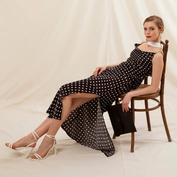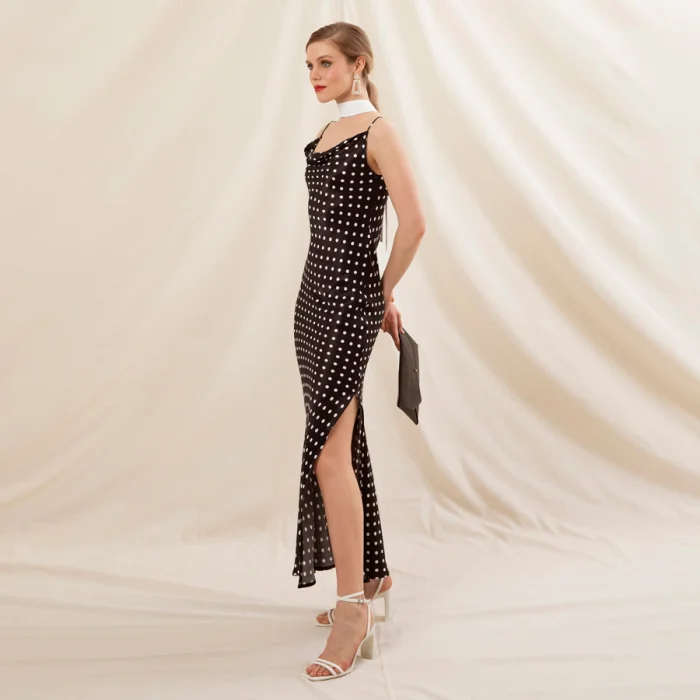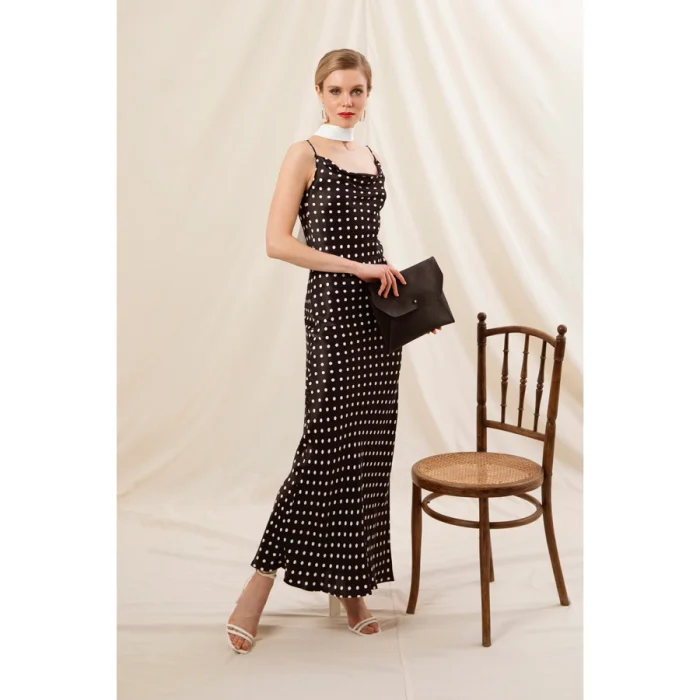 Kendi suni deri zarf çantasından çıkan, degaje göğüs detaylı krep saten kumaştan üretilmiş , ayarlı askılı, eteği yırtmaçlı bilekte elbise.