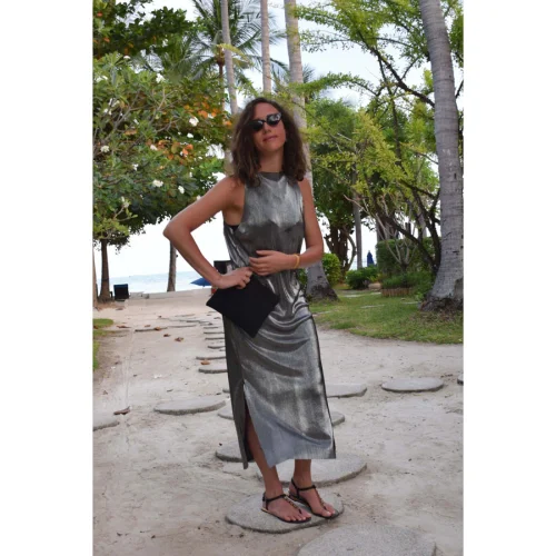 Kendi C-ya çantasının içinden çıkan kırışmayan kumaştan üretilen, yan dikişlerden yırtmaçlı çift taraflı giyilebilen kayık yaka krinkle elbise.