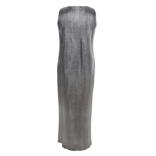 Kendi C-ya çantasının içinden çıkan kırışmayan kumaştan üretilen, yan dikişlerden yırtmaçlı çift taraflı giyilebilen kayık yaka krinkle elbise.