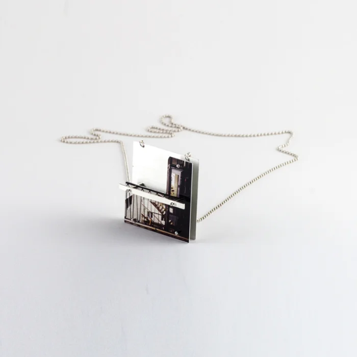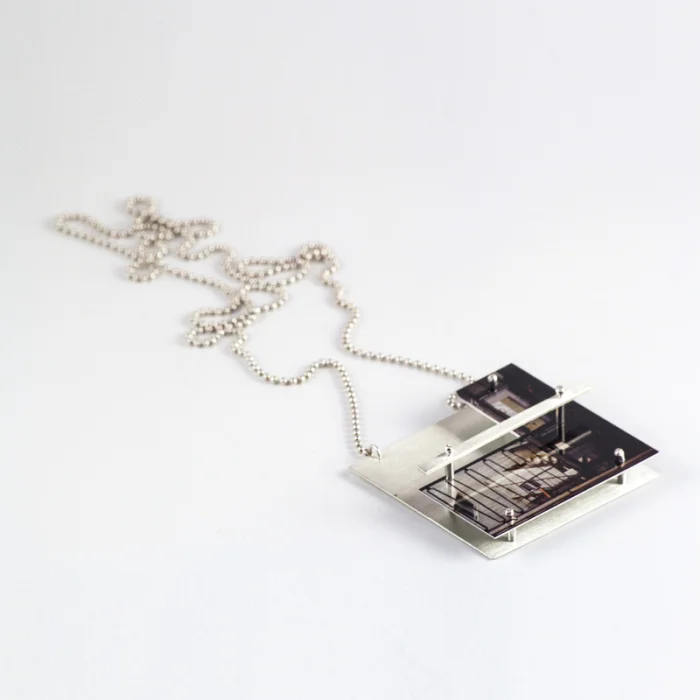 El yapımı, gümüş - alüminyum kolyedir. Kolye uzunluğu 74 cm'dir.