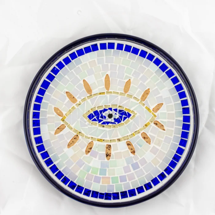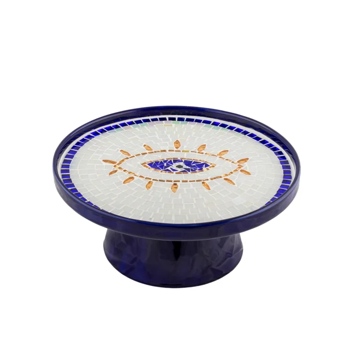 25 cm çapındaki Nazar Ayaklı Sunum Standı seramik üzerine beyaz sedef ve altın cam döşemesinden yapılmıştır. Kendi özel kutusunda gönderilir.