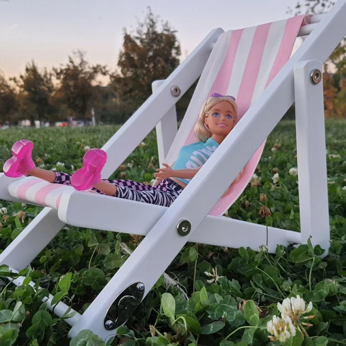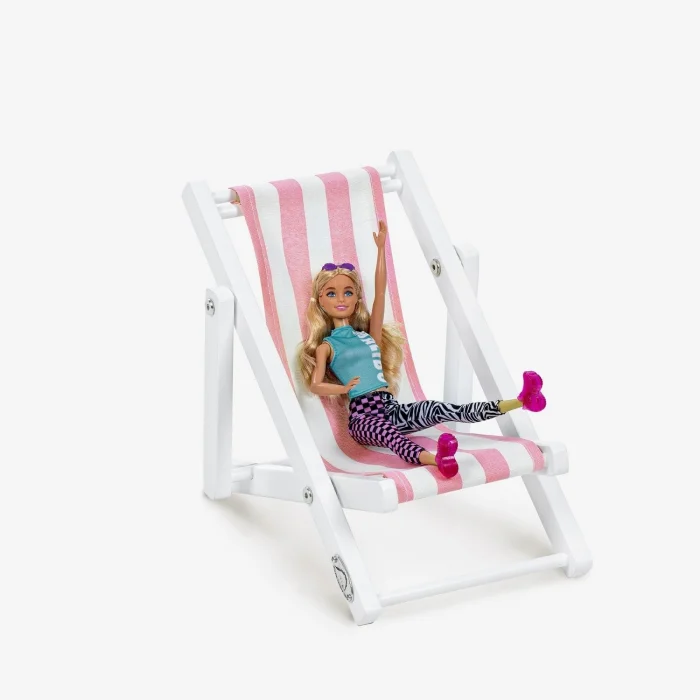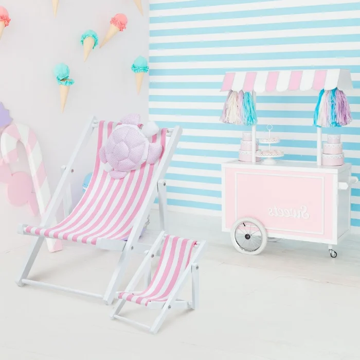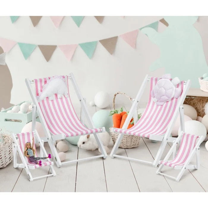 - Su bazlı beyaz boyalı masif ahşap oyuncak bebek koltuğu. Pembe-beyaz çizgili minder dahil.