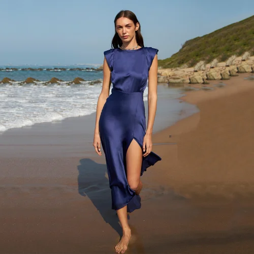 Lacivert mat saten kumaş. • Omuzlarda vatka bulunmaktadır. • Etek asimetrik kesimdir. • Elbise astarsızdır ve iç göstermez.