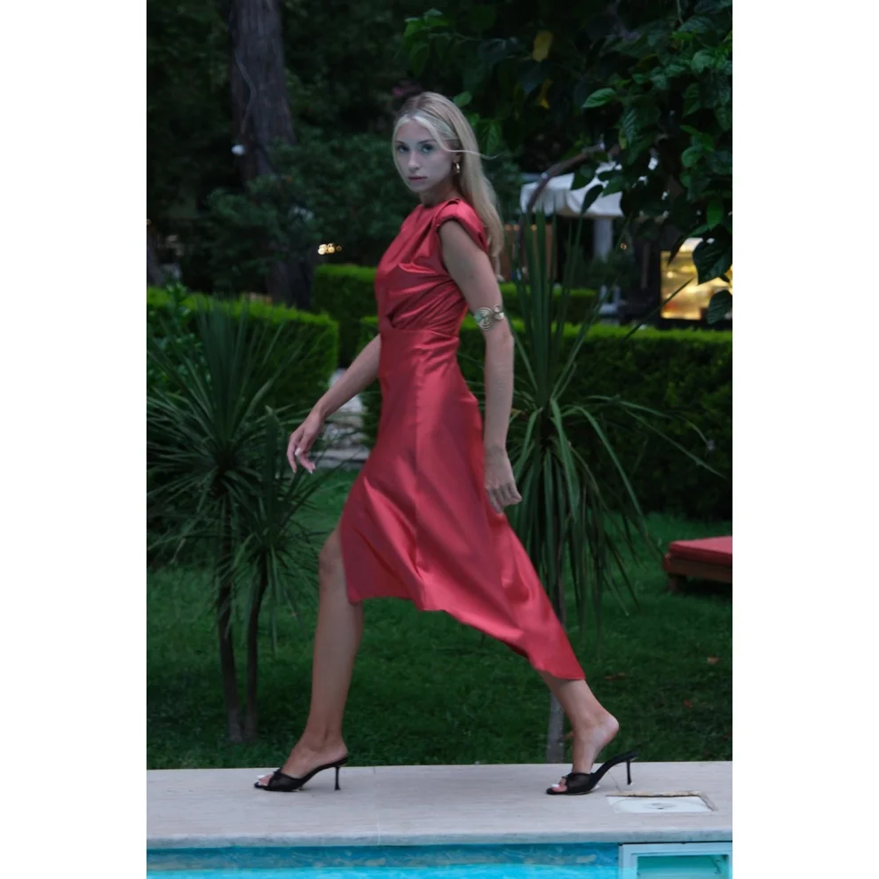 Bele oturan midi elbise. Mat Saten. Sadece kuru temizleme. Yırtmaçlı uzun elbise. Omuzları vatkalı. Elbise astarsızdır ve iç göstermez.