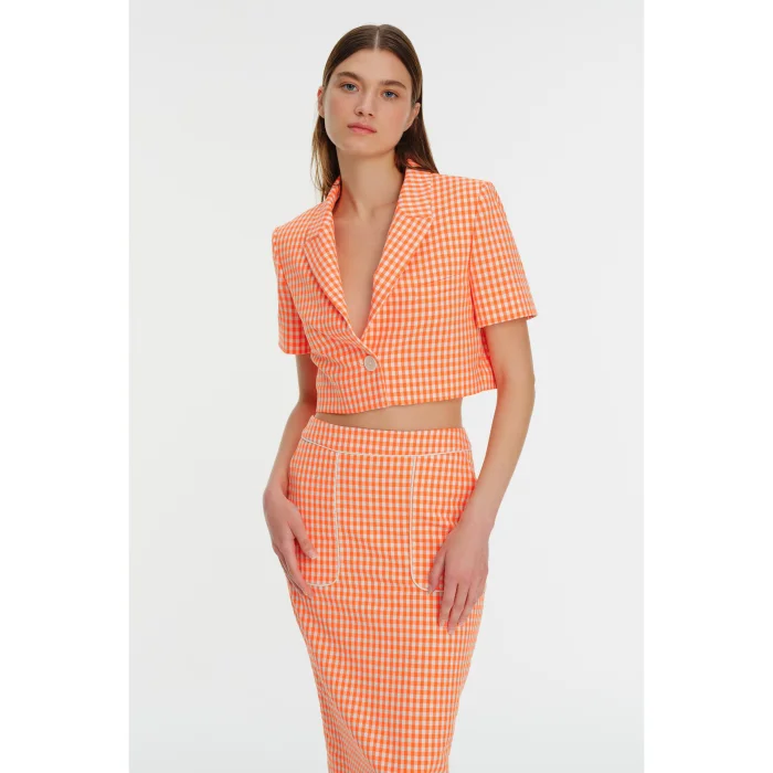 Ekose Desen Tek Düğmeli Kısa Kol Crop Ceket