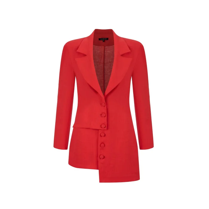 Hafif vatkalı omuzlar, keskin yaka, asimetrik kesim ve en yüksek kalite keten kumaşın buluşması ile koleksiyonun en iddialı tasarımlarından Rouje ceket elbise. BOY:179CM BEL:60CM BASEN:91 CM GÖĞÜS:81 CM. Model 34 beden giyiyor