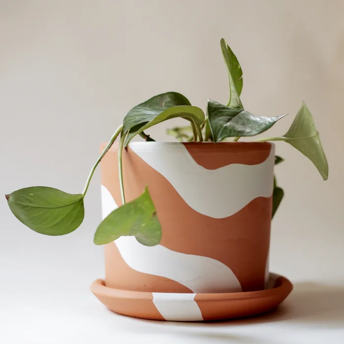 El Boyama Terracotta Saksı + Tabak. El yapımı bir ürün olduğu için desen ve ebatlarında az miktarda olsa değişiklik gösterebilir. Görseldeki bitki fiyata dahil değildir.