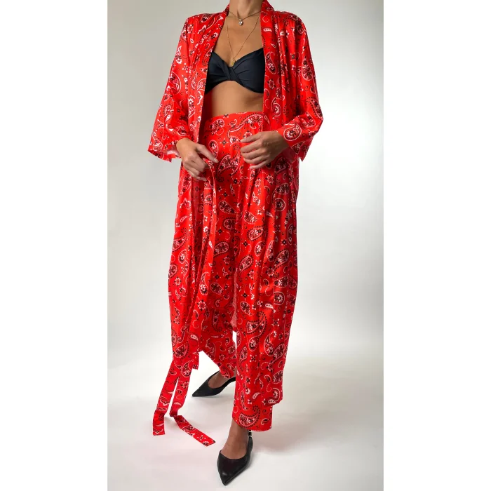 Hafif Ve Serin Tutan Saten Kumaştan Üretilen Harem Pantolon, Takımı Olan Uzun Kimono Ve Oversize Ceket İle Kombinlenebilir.