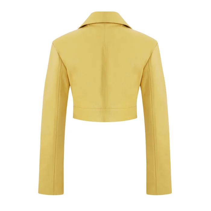 Gömlek yaka, pastel sarı deri ceket. %100 Kuzu Derisi. Beden Astarı %100 Viskon Kumaş. Kol Astarı %100 Viskon Kumaş