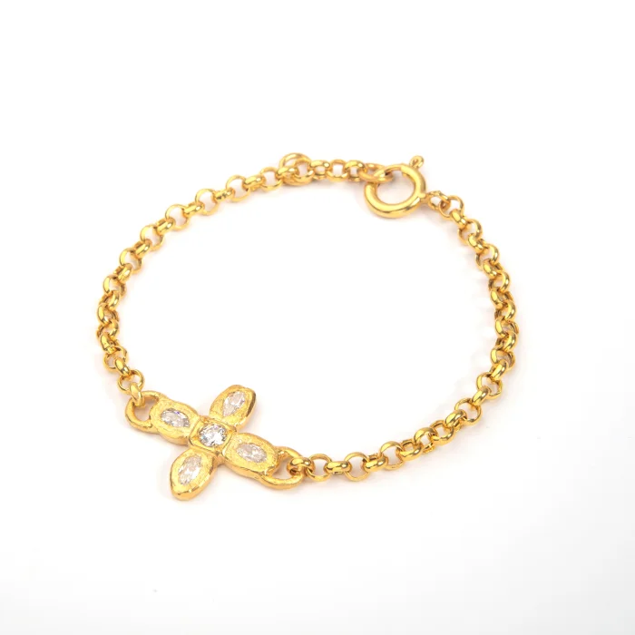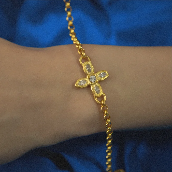 Minerva Bilekliği, geri dönüştürülmüş 925 ayar gümüşten üretilmiş, 24 ayar altın kaplamalı bir tasarımdır. Tamamen el yapımıdır ve laboratuvar üretimi pırlanta ile süslenmiştir.