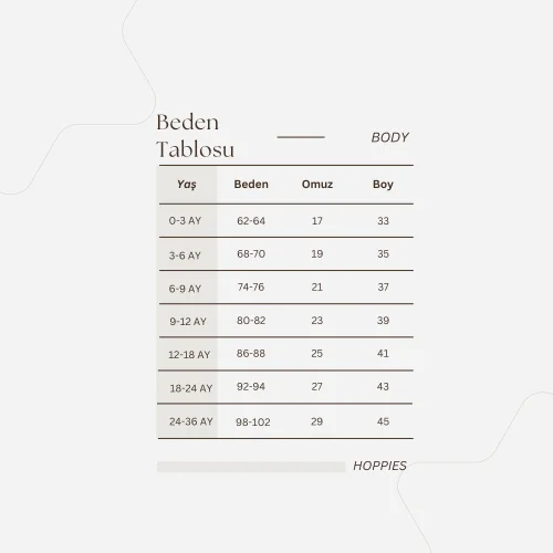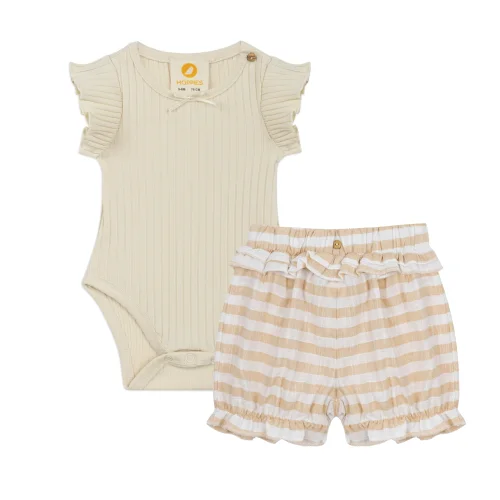 Şort %100 Oeko-tex standartında pamuklu kumaştan, body %96 pamuklu, %4 elastan kumaştan üretilmiştir. Takım body ve bloomer tarzı şorttan oluşmaktadır. Body alttan çıtçıtlı, sıfır yakalı, yandan ahşap düğme kapamalıdır. Yakada minik saten fiyongu bulunur, kolları fırfırlıdır. Şortun beli lastikli ve fırfır detaylı bulunur. Kumaşı çizgili dokuma kumaştır. Bej - krem ve Mavi - krem renk alternatifleri bulunur. Paçaları lastikli ve fırfırlıdır. Ağ kısmı geniştir, rahat hareket kabiliyeti sağlar. Body ve şort şık bir kombin oluşturmuştur. Ürünlerimiz çevreye duyarlı sürdürülebilirlik ilkesi gözetilerek üretilmiştir. Tüm aksesuarları doğal malzemedir. Kimyasal boyalar ve kanserojen maddeler içermez. Alerji yapmaz.