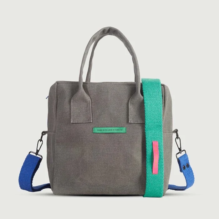 Mumlu kanvas kumaşından üretilen Huge Element Hitta Bag Gri renk; çift taraflı kullanıma uygun, mavi kemik fermuarlı, tutma saplı, küçük iç cepli ve ayarlanabilir dar dokuma kısa yeşil 58 cm ve uzun mavi 130 cm çanta askısı ile teslim edilmektedir. Ürün temizliği ve bakımı için; kirlenen bölgeye ılık ve nemli bir bez yardımı ile ovalama yapılır. Kuruması için direkt güneş ışığından uzakta serin ve kuru yerde kurumaya bırakılmalıdır. İnatçı lekeler için profesyonel destek alınmalıdır. Çamaşır makinesinde yıkanması ve ütü tavsiye edilmez. Türkiye'de tamamen kadın çalışanların emeği ile üretilmektedir.