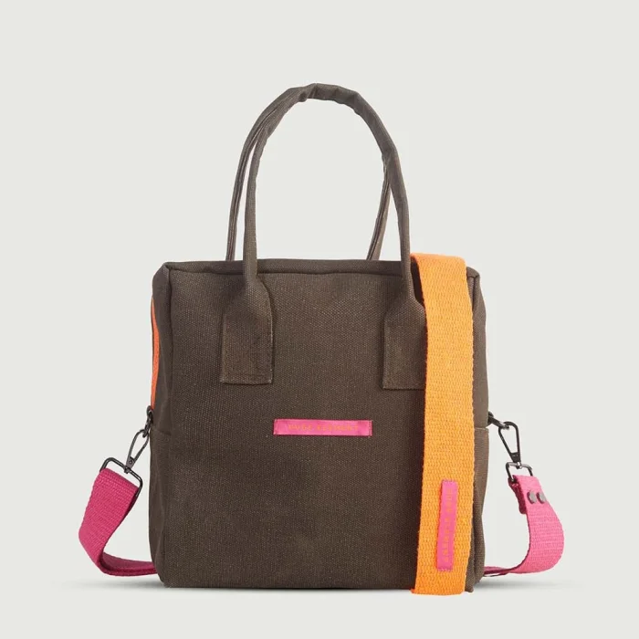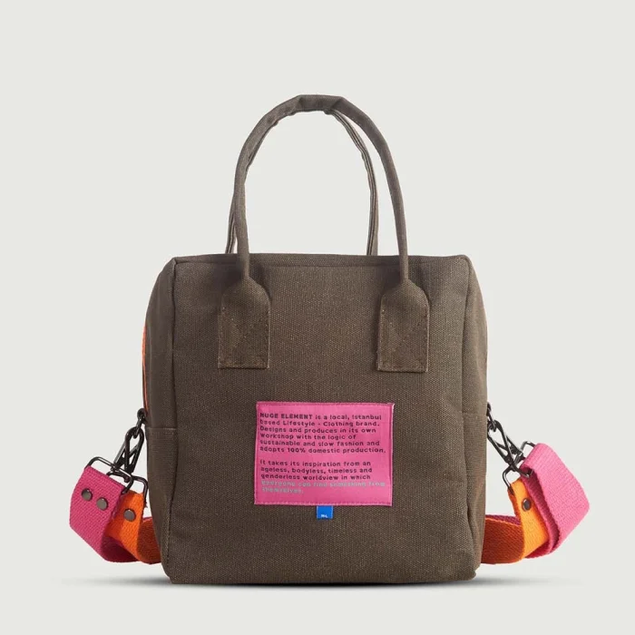 Mumlu kanvas kumaşından üretilen Huge Element Hitta Bag Kahverengi renk; çift taraflı kullanıma uygun, mavi kemik fermuarlı, tutma saplı, küçük iç cepli ve ayarlanabilir dar dokuma kısa turuncu 58 cm ve uzun pembe 130 cm çanta askısı ile teslim edilmektedir. Ürün temizliği ve bakımı için; kirlenen bölgeye ılık ve nemli bir bez yardımı ile ovalama yapılır. Kuruması için direkt güneş ışığından uzakta serin ve kuru yerde kurumaya bırakılmalıdır. İnatçı lekeler için profesyonel destek alınmalıdır. Çamaşır makinesinde yıkanması ve ütü tavsiye edilmez. Türkiye'de tamamen kadın çalışanların emeği ile üretilmektedir.
