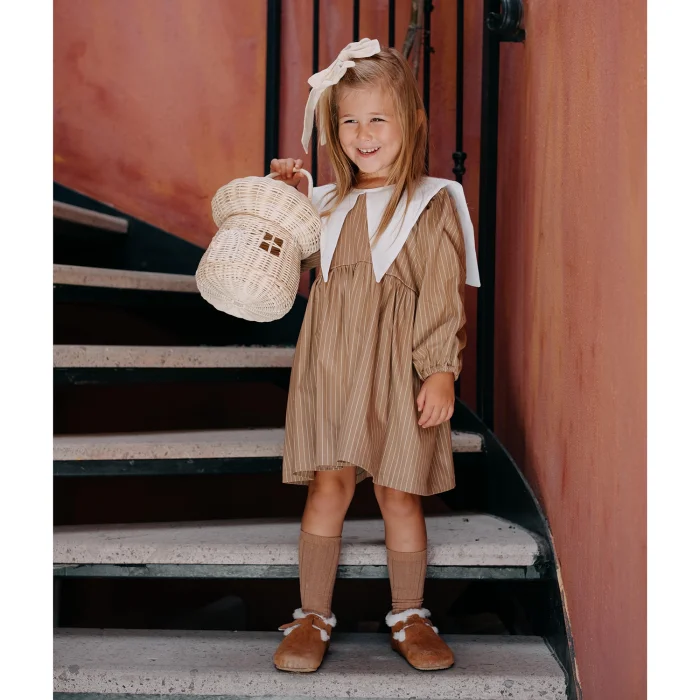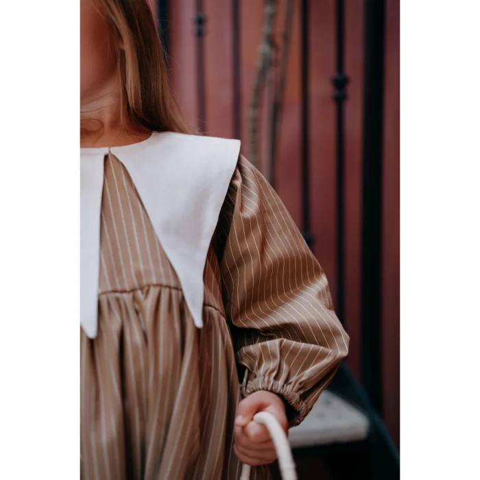 Krem beyaz çizgili elbise. Üçgen kesim beyaz yaka detayı.