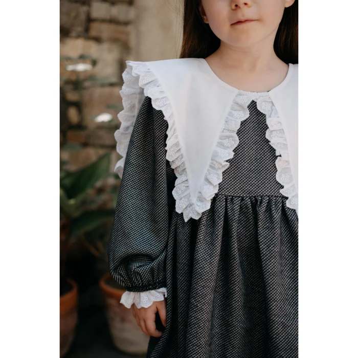 Lacivert renk elbise. Üçgen kesim, kenarları fisto beyaz yaka detayı.