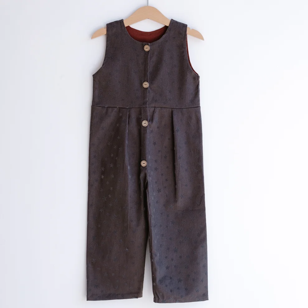Rahat kesim, önden düğmeli yeni yıl konseptli tulum.