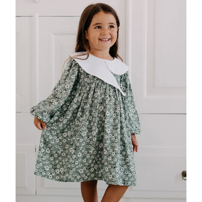 Mint çiçek nakışlı kumaş elbise. Beyaz asimetrik kesim yaka detayı.