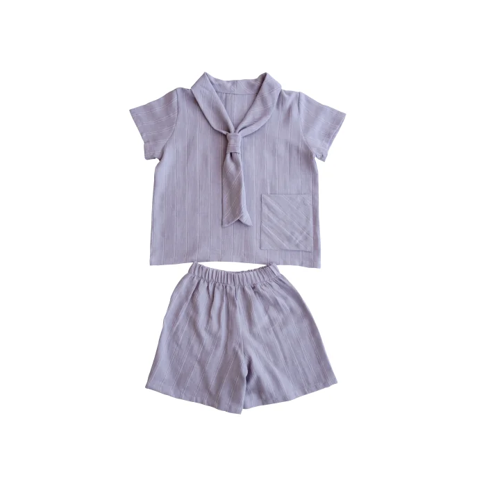 Ferah, çizgili mavi kumaşıyla denizci stil gömlek ve rahat kesim şort takım.