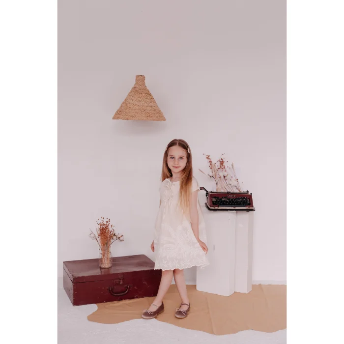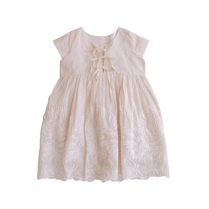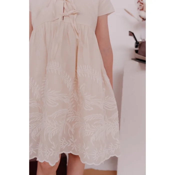 Önü bağlama detaylı, karpuz kollu krem rengi fisto elbise.