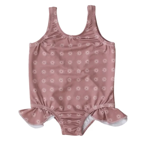 Paçasında fırfır detaylı, güneş desenli kız çocuk mayosu. Esnek, rahat ve hızlı kuruyan kumaş.