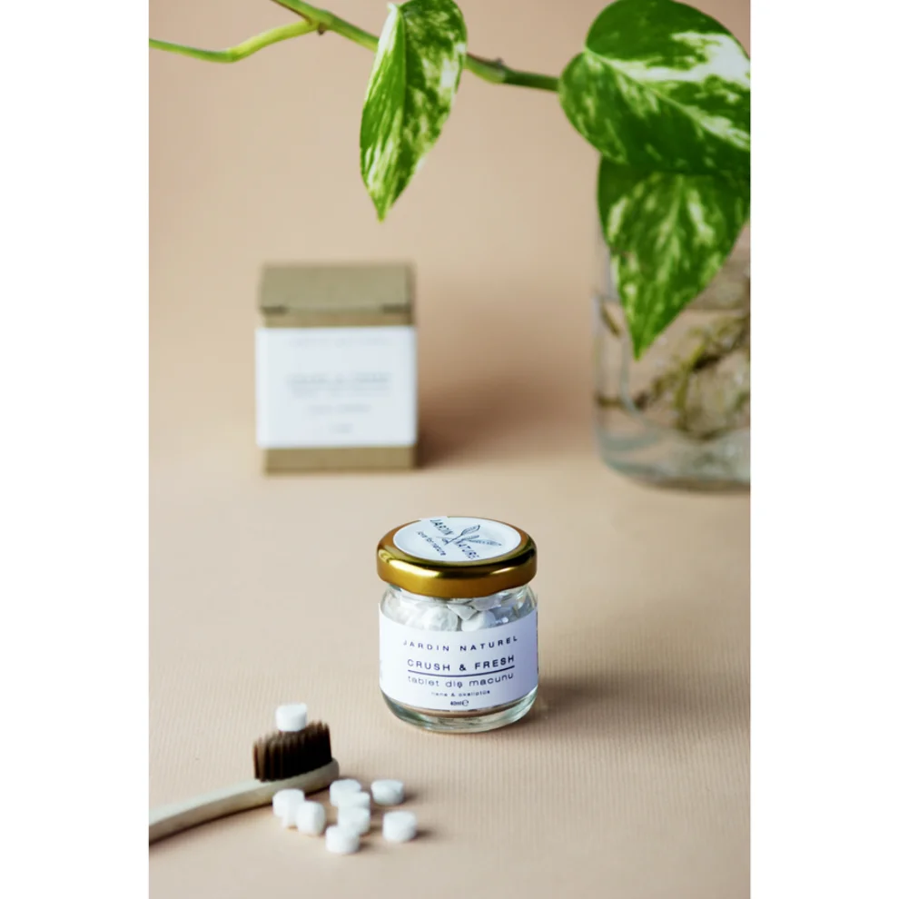 Crush & Fresh Tablet Diş Macunu, diş macununun tek kullanımlık tablet versiyonudur. Katı formda olduğu için koruyucu içermez. Dişlerin temizlenmesine yardımcı olur. SLS/SLES, paraben, triklosan, esans, florür içermez. Tıbbi nane & okaliptüs yağları ile ferahlık hissi verir.