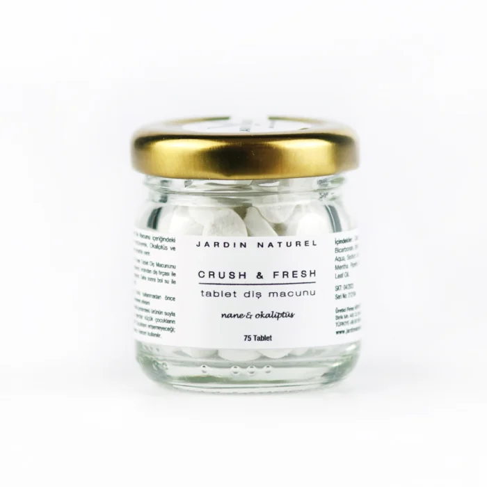 Crush & Fresh Tablet Diş Macunu, diş macununun tek kullanımlık tablet versiyonudur. Katı formda olduğu için koruyucu içermez. Dişlerin temizlenmesine yardımcı olur. SLS/SLES, paraben, triklosan, esans, florür içermez. Tıbbi nane & okaliptüs yağları ile ferahlık hissi verir.