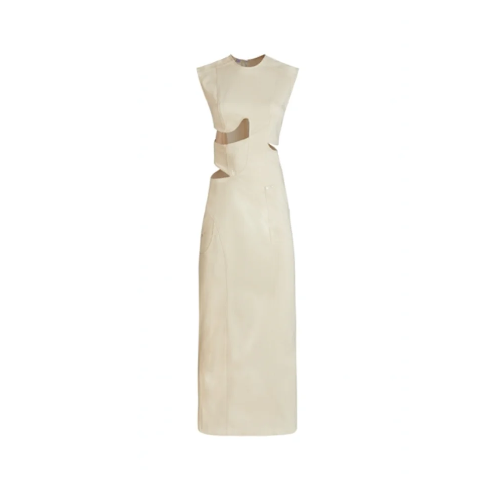 ve metal aksesuarlar iddialı bir dokunuş katıyor.Derin mavi tonu üzerine cesurca eklenmiş olan kontrast renkli dikişler bu dikkat çekici elbiseyi tamamlıyor.