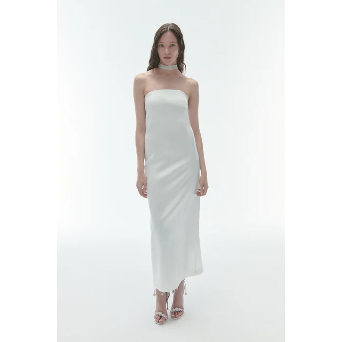 Straplez arkadan yırtmaçlı saten midi elbise.