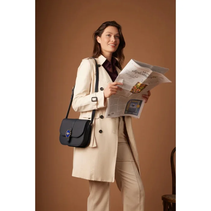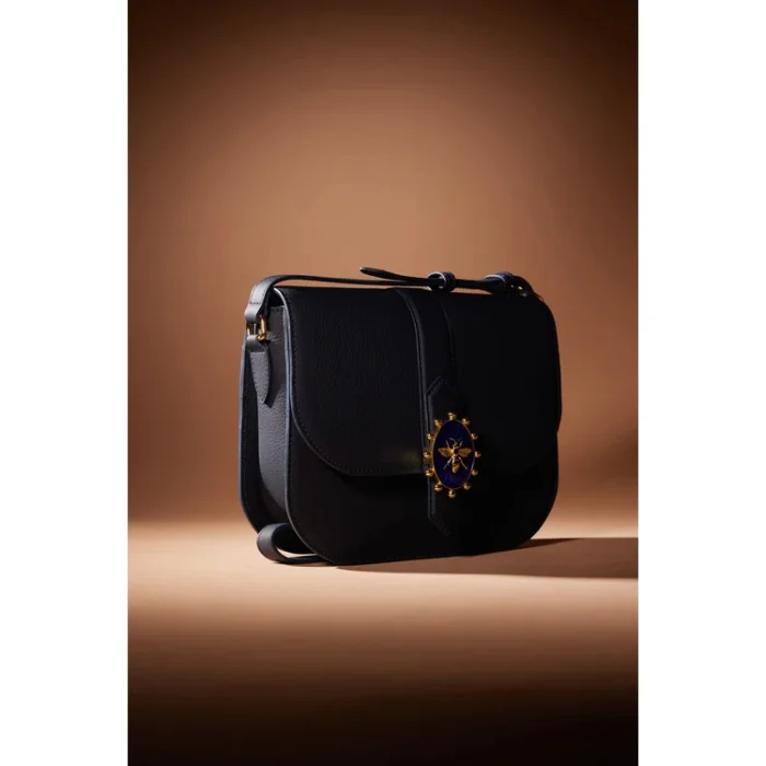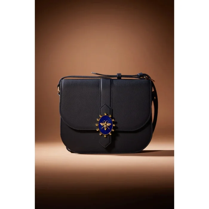 100% deri Renk: Lacivert, Kraliçe Arılı Mücevheri ile (el yapımı, altın kaplama bronz değiştirilebilir mücevher) Askı: Ayarlanabilir Askı Boyu:45 cm Askı Boyu Max:54 cm İç: Fermuarlı cep ve küçük bir cep