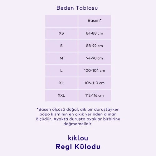 Sıvı geçirmez katmana sahip, emici, atıksız, kokuya karşı ve konforlu bu regl külodu, reglin yoğun günlerinde giymen için ileri tekstil teknolojisiyle tasarlandı 3-4 normal pede ya da 4-5 normal tampona denk koruma sağlar, kuru hissettirir. Makinede yıkanabilir ve senelerce giyilebilir. Kumaş Bileşenleri: Tene Değen İç Kumaş: %100 Organik Pamuk Tene Değen Ağ Üst Kumaş: %95 Polyester, %5 Elastan Ağ Ara Katmanları: %100 Polyester, PU-Membran Dış Kumaş: %80 Poliamid, %20 Elastane. Kiklou ürünleri kişisel hijyen ürünleri sınıfındadır. Hipicon ve Kiklou iade politikalarında da yer aldığı gibi sağlık ve hijyen koşulları sebebiyle paketi açılmış regl külotlarında iade ve değişim yapılmamaktadır.