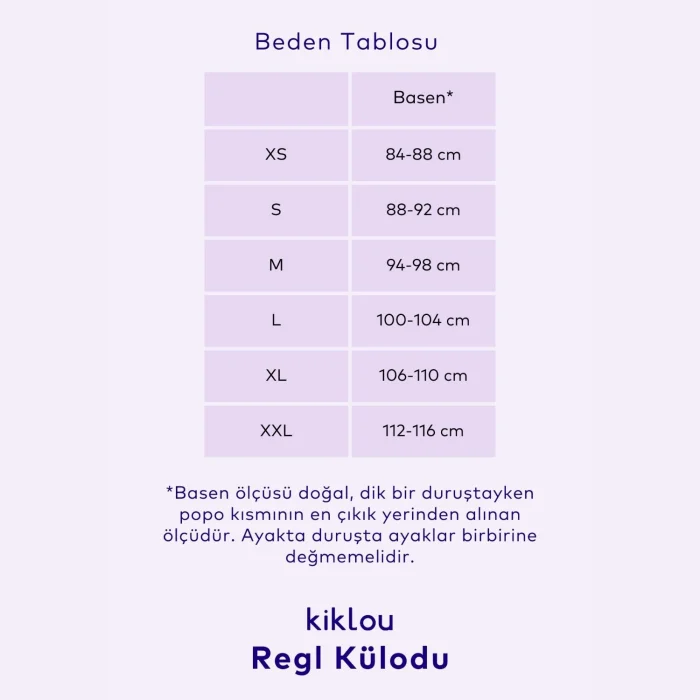 Sıvı geçirmez katmana sahip, emici, atıksız, kokuya karşı ve konforlu yüksek belli bu süper emici regl külodu, reglin yoğun günlerinde giymen için ileri tekstil teknolojisiyle tasarlandı. Ek koruma için popoyu tamamen sarar. 3-4 normal pede ya da 4-5 normal tampona denk koruma sağlar, kuru hissettirir. Makinede yıkanabilir ve senelerce giyilebilir. Kumaş Bileşenleri: Tene Değen İç Kumaş: %100 Organik Pamuk Tene Değen Ağ Üst Kumaş: %95 Polyester, %5 Elastan Ağ Ara Katmanları: %100 Polyester, PU-Membran Dış Kumaş: %80 Poliamid, %20 Elastane. Kiklou ürünleri kişisel hijyen ürünleri sınıfındadır. Hipicon ve Kiklou iade politikalarında da yer aldığı gibi sağlık ve hijyen koşulları sebebiyle paketi açılmış regl külotlarında iade ve değişim yapılmamaktadır.