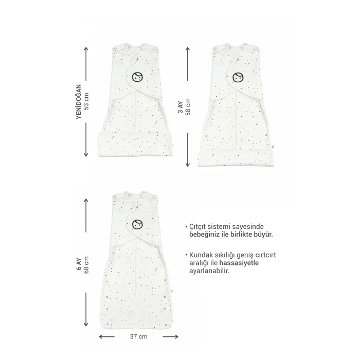 Ayarlanabilir çıtçıtları ile yenidoğan bebeklerden 6 aylık bebeklere kadar kullanılabilir.