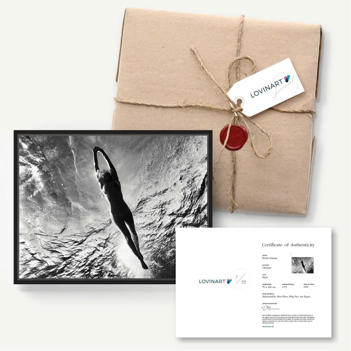 Eserlerin rulo halinde yalnızca fine art baskılarını sipariş verebilir, ve hatta modern çerçeve alternatiflerimizden zevkine uygun olanı seçip, asılmaya hazır halde teslim alabilirsin. Tamamıyla el işçiliği ve titizlikle gerçekleştirdiğimiz çerçeveleme işlemini, uzun ömürlü, kaliteli malzemelerle yapıyoruz.