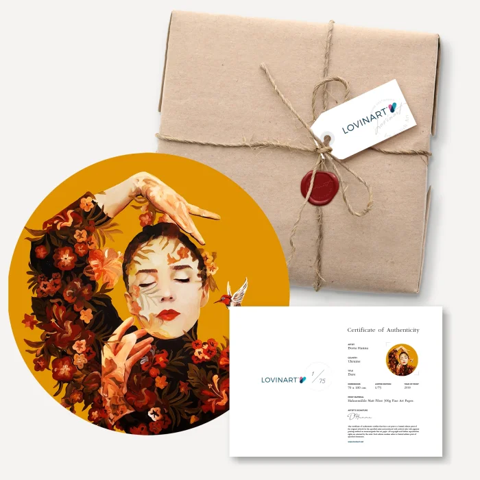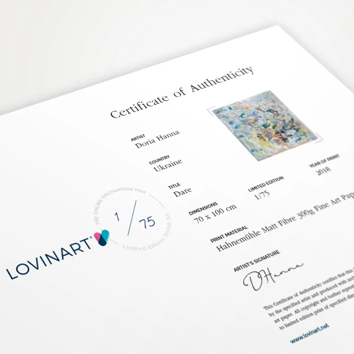 LİMİTLİ EDİSYON SANAT BASKILARI Edisyonlu sanat eseri, bir asıl eserin kopyalanmış veya bire bir yeniden üretilmiş versiyonu olarak tanımlanır. Limitli edisyonlarda üretim yapılırken eserin kaç edisyon olarak üretileceği, eser sahibi sanatçı gözetiminde önceden belirlenir ve eser bu adetten fazla üretilmez. ORİJİNALLİK SERTİFİKASI Limitli edisyonlu bir sanat eseri, sanatçı imzası ve hangi adetli edisyonun kaçıncı kopyası olduğu üzerinde belirtilen 'Orijinallik Sertifikası' ile birlikte sanat alıcısına gönderilir. Ayrıca, hangi teknikle ve kalitede üretildiği, kullanılan fine art kağıdı dahil tüm baskı özellikleri sertifika üzerinde yer alır. MÜZE KALİTESİNDE BASKILAR VE MODERN ÇERÇEVELEME SEÇENEKLERİ Dünya standartlarında baskı yapan makinelerle, yalnızca 200 gram Hahnemühle fine art kağıda, Giclée (püskürtme) tekniği kullanarak ürettiğimiz müze kalitesinde arşivsel pigment baskılar; normal oda şartlarında 100 yıldan fazla ömrü olan fine art baskılardır. Asitsiz ve %100 pamuk tabanlı, detay ve renklerde orijinal esere yakınlık bakımından mükemmel sonuç veren Hahnemühle fine art kağıtlar, solmaya karşı da garantilidir. DIASEC ürünler C-Print tekniği ile Metalik Fotoğraf Kağıdına basılır. Eserlerin rulo halinde yalnızca fine art baskılarını sipariş verebilir, ve hatta modern çerçeve alternatiflerimizden zevkine uygun olanı seçip, asılmaya hazır halde teslim alabilirsin. Tamamıyla el işçiliği ve titizlikle gerçekleştirdiğimiz çerçeveleme işlemini, uzun ömürlü, kaliteli malzemelerle yapıyoruz.