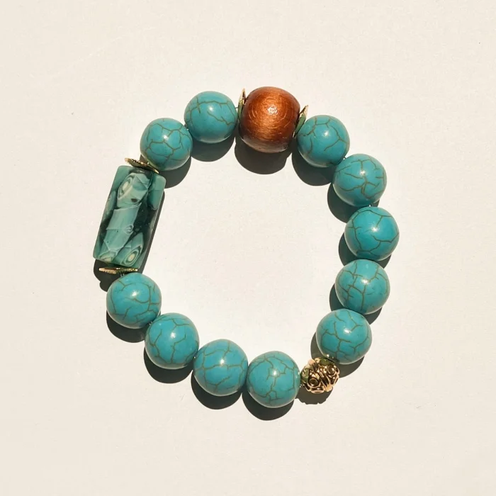 Turkuaz taşı,Gana afrika boncuk ve doğal ahşap boncuk kullanılmıştır.