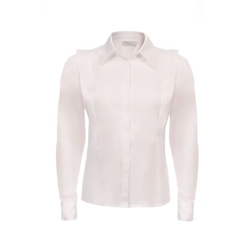 volanlı, önü gizli pat dikim, gizli düğmeli, uzun kollu, bedene oturan poplin gömlek