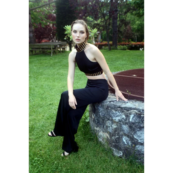 Siyah şıklığının gold havasıyla birleştiği hafifletici saten dokunuşlar. Görseldeki model 36 beden giymektedir* Model Ölçü Bilgileri Göğüs:86-90cm Bel:63-67cm Basen:93-97cm