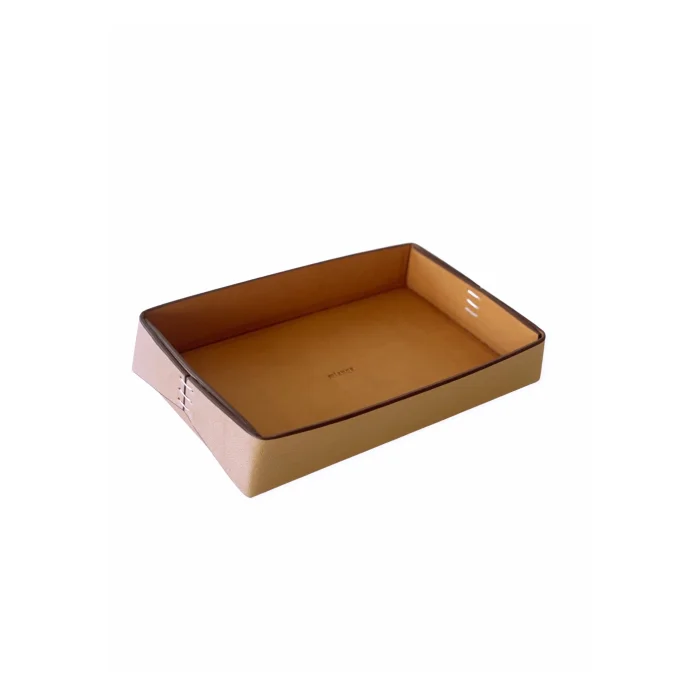 En yüksek kalitede zanaatkarlıkla üretilmiş, "elma derisi" olarak bilinen bitki bazlı bir vegan malzemeden yapılmış olup, lüks deri hissine sahiptir. Dekoratif el dikişleriyle, minimalist modern tasarımıyla her odaya zarif bir dokunuş ekler. İki boyutta sunulmaktadır: Küçük boy, 26 cm x 17 cm ölçülerinde ve Büyük boy, 35 cm x 21 cm ölçülerindedir.