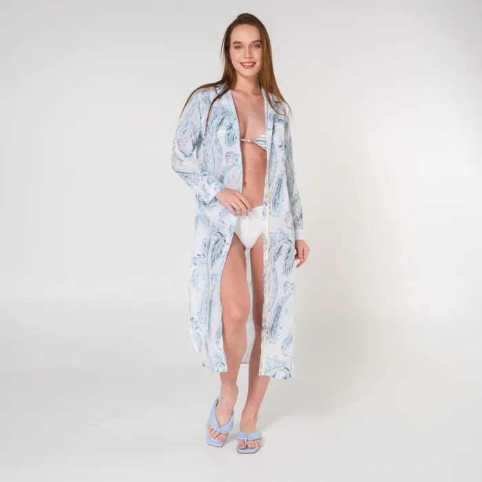 Farklı renk ve desenlerde özel olarak tasarlanmış Miespiga Kadın Şal Desen Vual Gömlek Plaj Elbiseler zarif ve şık bir görüntüye sahiptir.