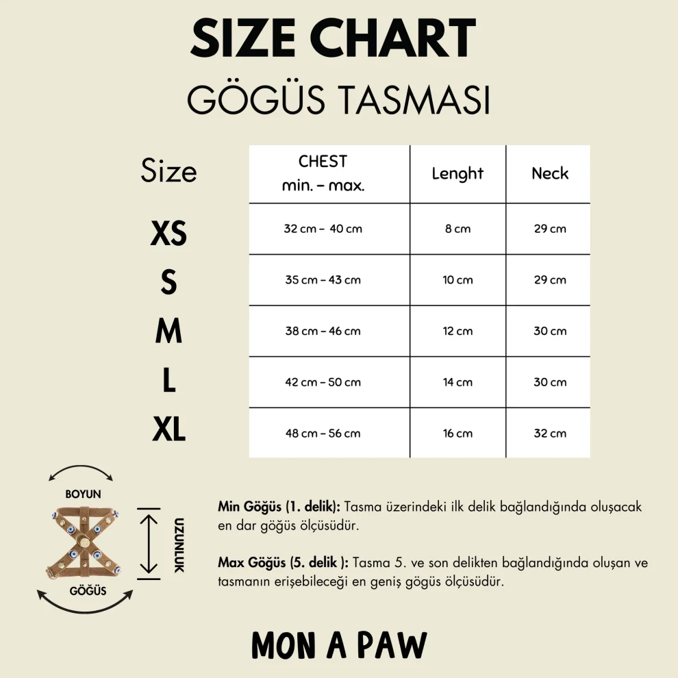 Yumuşacık Kahverengi vegan dostu Süet deri üzerine cam nazar boncukları ve altın kaplama minik patiler ile zarif bir şekilde süslenmiştir. Bu Harness, hem günlük kullanım için mükemmel bir seçenek sunarken hem de özel günlerde köpeğinizin stilini tamamlamak için benzersiz bir aksesuar olacaktır. Aynı renkteki nazar boncukları ile bezenmiş gezdirme kayışı ile köpeğinizin görünümünü tamamlayabilirsiniz.
