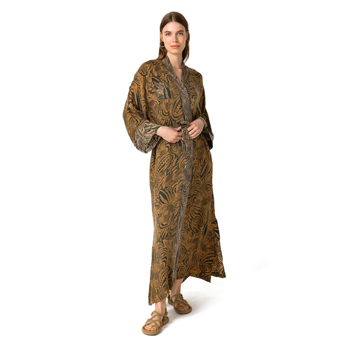 •Sırt ortası ve kollarda çapraz nakış detaylı •Beli Kemerli •Tam uzunluk omuzdan 130 cm •Karbon ayak izi bırakmayan bu malzeme, başından sonuna kadar hayvansal malzeme olmamasını sağlayan yenilikçi bir vegan tekstil işlemiyle üretildi. •Yumuşacık ipeksi kumaş size nazik olduğu kadar dünyaya da nazik